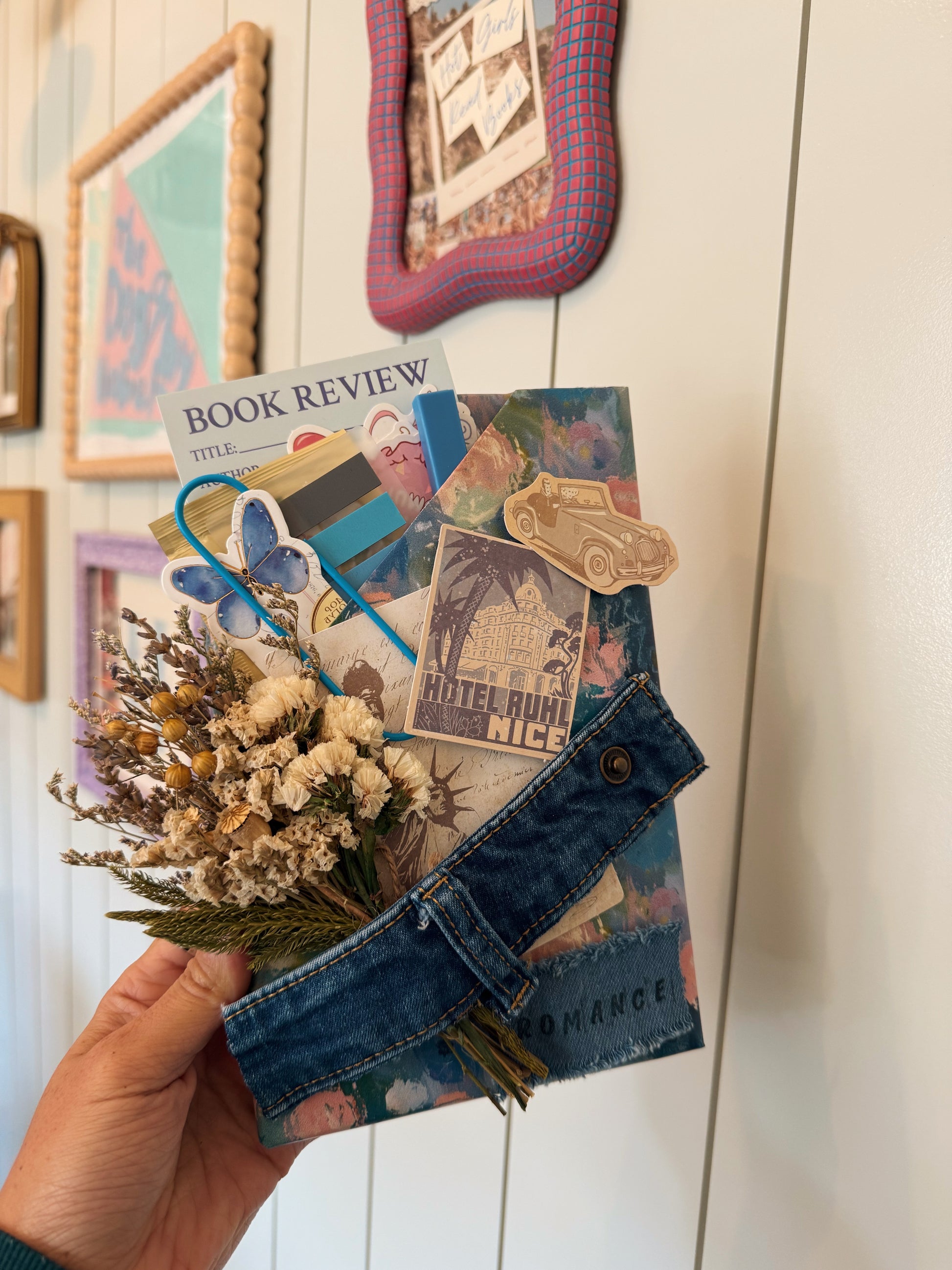 A book of the genre of your choice, extravagant, layered wrapping, Artful extras, surprises, and all the cozy chaos we could sprinkle in. 4-5 fun and exciting bookish stickers, a custom bookmark, annotating tabs,a detailed book review for you to fill out, a annotating highlighter, and an unforgettable experience. Unlock all the possibilities of diving into a new book and escaping the everyday for a little while. This is for the reader who wants is all. Sweet, swoony, and seriously extra.